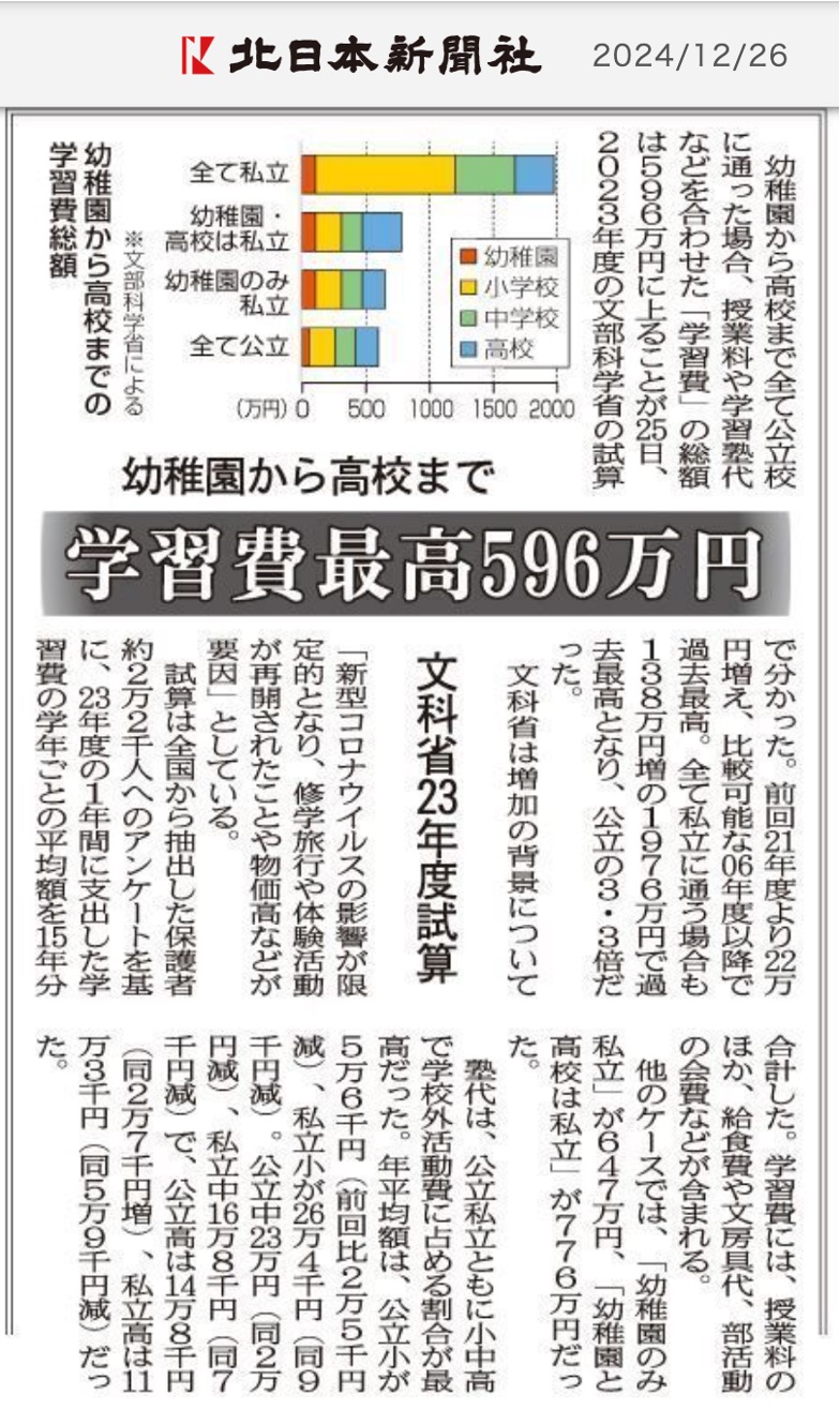 幼稚園から高校までの学習費(授業料や給食代、学習塾代など)の合計が、全て公立に通った場合でも、596万円となり、過去最高になったということです。