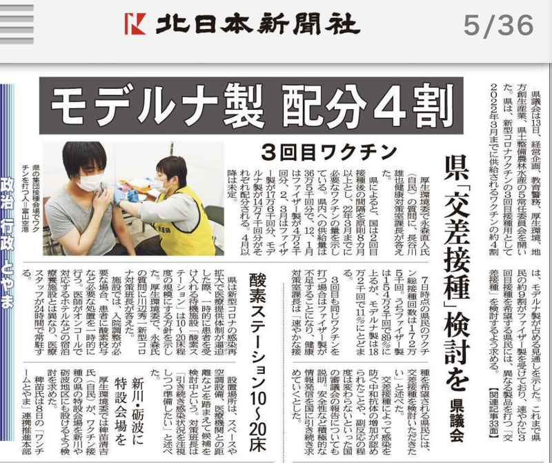 1回目、2回目のワクチン接種については、ファイザーの接種者の割合が89%なのに対し、モデルナの接種者は11%となっている一方、3回目の政府からのワクチン配分は、ファイザー6割、モデルナ4割となっており、このことについて質問したところ、県厚生部からは3回目を接種を速やかに希望する場合には、1,2回目と異なる種類のワクチン接種を行う「交差接種」を検討するよう啓発していく旨の答弁がなされました。