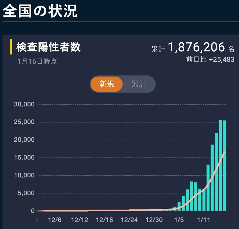 感染拡大の兆候が見られた1月5日ごろから、わずか10日あまりで、過去最多とレベルとなる25000人まで感染は拡大しており、このペースが続くとすれば、これまでの過去最多を大幅に更新する感染レベルとなりそうです。