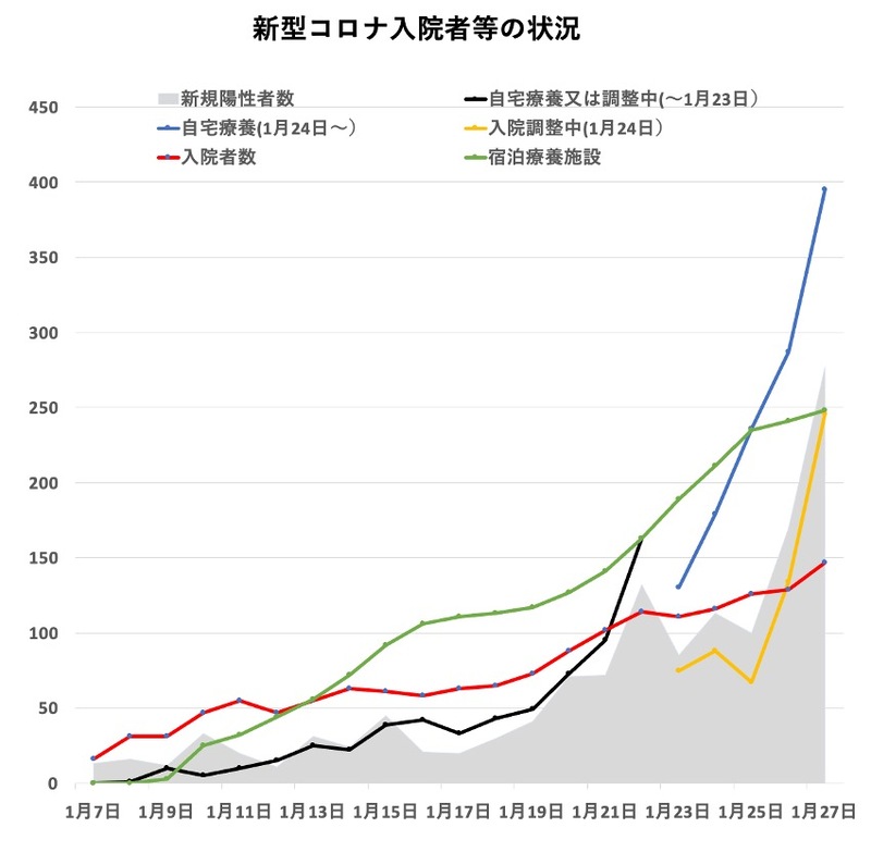 宿泊療養施設の入所者数(緑色)は、248人(昨日比7人増)と、昨日に続き、伸びが鈍化しています。宿泊療養施設の収容能力は、400〜500室程度はあるとのことであり、入所を、真に必要な人に限るなどコントロールしているのかもしれません。
