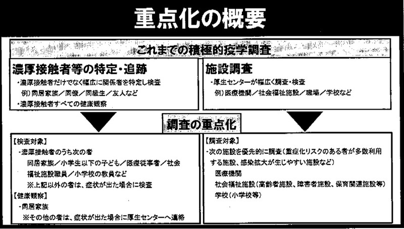 具体的には、①濃厚接触者の追跡は全員ではなく、同居家族や医療従事者、社会福祉施設職員などに限り、他の方は、症状が出た場合にのみ厚生センター等へ連絡して検査。②クラスター調査は、重症化リスクの高い方の多い施設を優先(医療機関、社会福祉施設、学校)などとなるようです(下図)