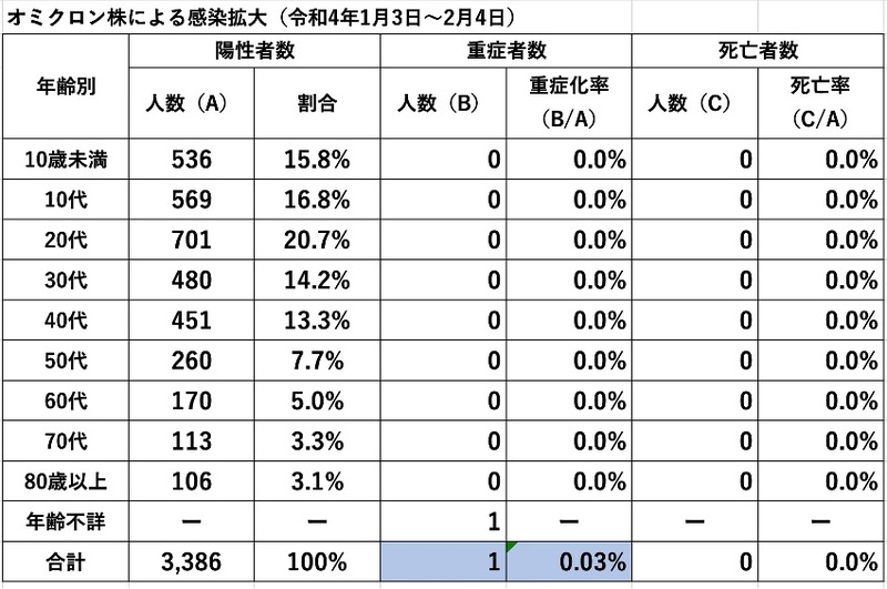 次に、富山県の本年1月以降のオミクロン株による感染の状況です。感染者数は急増しており、このままいけば、デルタ株以前の感染者数を超えるのは時間の問題です。しかし、その中身はいかがでしょうか?