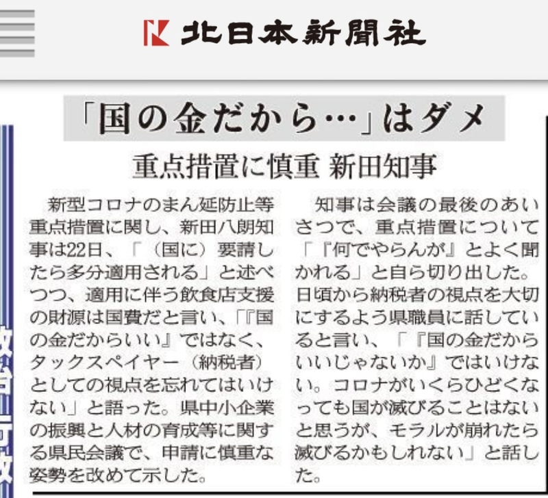 本日の朝刊に新田知事の発言が掲載されていましたね。ツイッター上などにも様々な意見が飛び交っています。