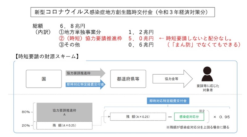 「まん防」が適用された地域(正確には「まん防」でなくても時短要請すればよい)は、富山県同様に、地方単独分(1.2兆円)としての交付金の配分を受け、さらに追加的に時短要請枠としての5兆円からの配分も受けています。具体的には、この5兆円の枠から、時短要請協力金として支払った金額の8割は補填され、さらに追加的に支援される仕組みもあるようです。