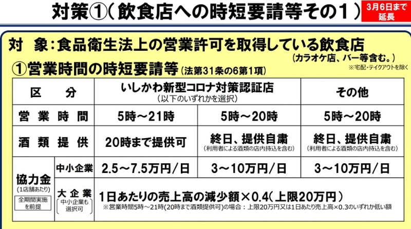 石川県は1月25日から時短要請をしており、3月6日まで続きます(39日間です)。