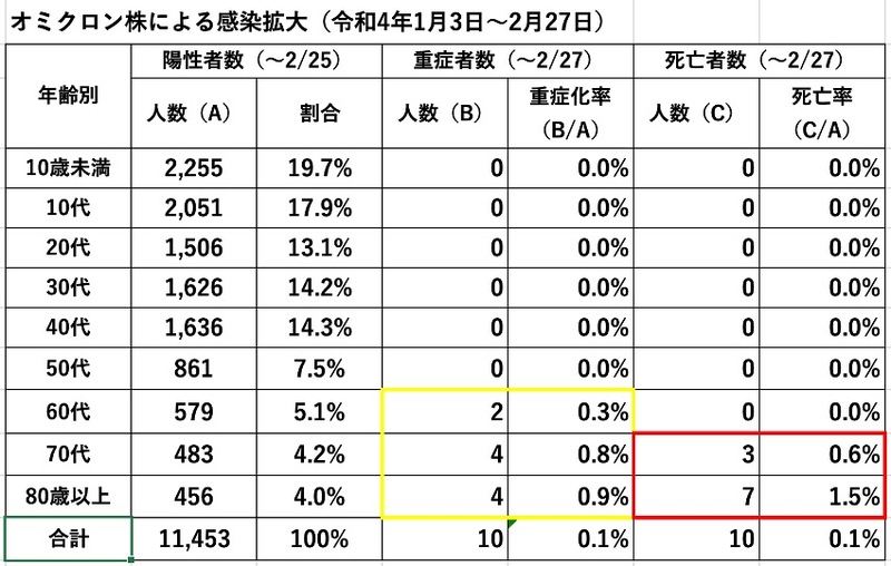 まずオミクロン株流行以降の年代別の感染者数と重症者・死亡者の状況です。