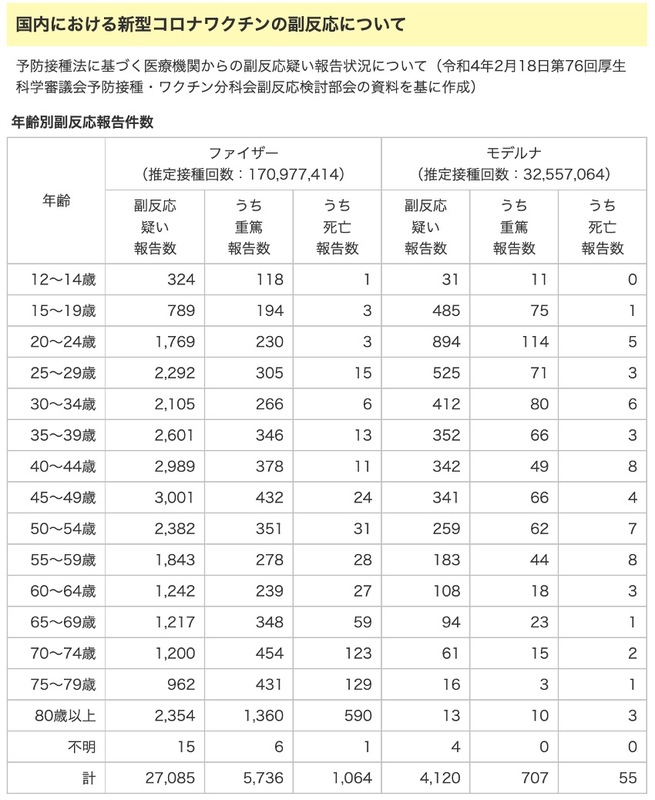 他方で、全国のワクチンの副反応の状況(資料・泉大津市HPより)をみると、こちらも割合的には極めて稀とは言えますが、副反応により10代・20代で重篤な副反応の出ているケースもあります。