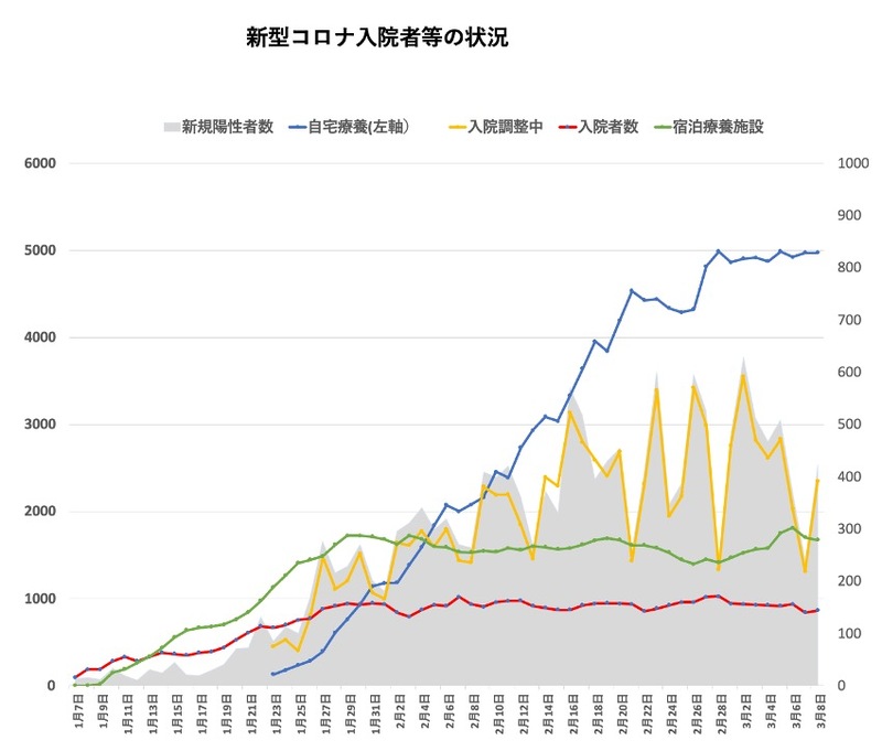 入院調整中(黄色)は391人(昨日比172人の増)です