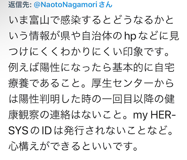 また、いただいたメッセージにおいては、健康観察についても指摘をいただいていますが、自宅療養であっても健康観察アプリ「my Her-Sys」のIDは発行されるということでした(ただし、富山市ではIDの発行が遅れる例があったそうです)。