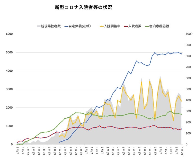 本日(3月10日)の富山県の感染者数は434人(無症状・軽症434、中等症0)となり、先週同曜日比では78人の減でした。先週比では3日連続の減少です。今度こそ収束にむかってくれると良いですね。