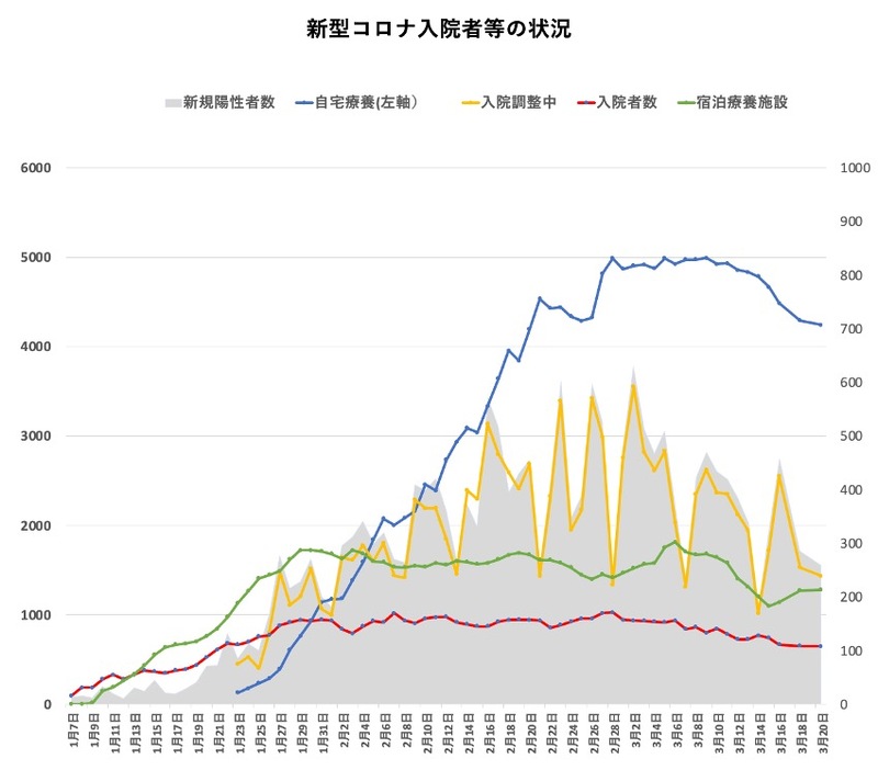 本日(3月20日)の富山県の感染者数は259人(無症状・軽症258、中等症1)となり、先週同曜日比では80人の減でした。