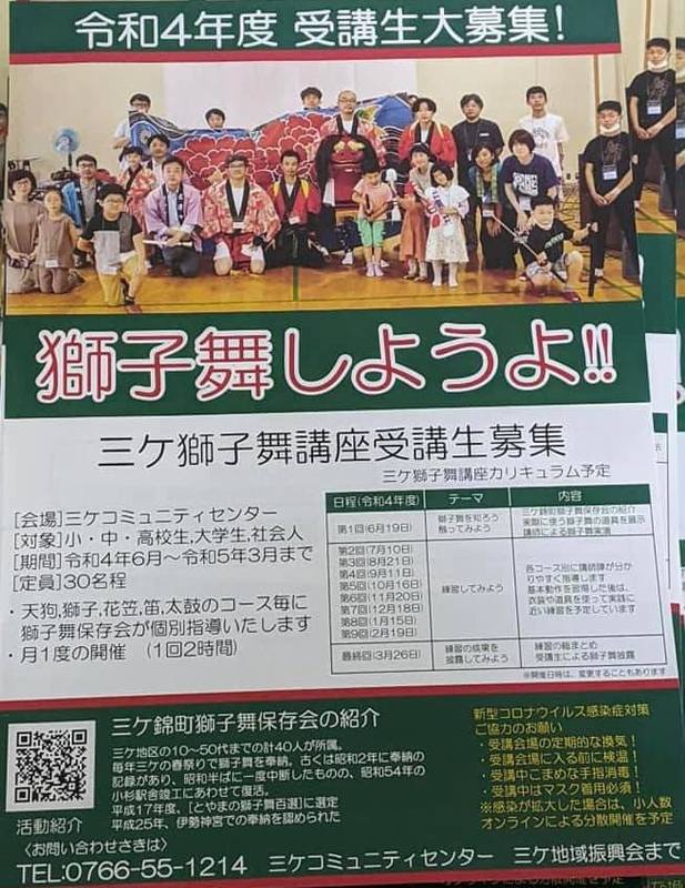 三ケ錦町の獅子舞を未来に向け継承していくための担い手を射水市内外から幅広く発掘し、育てる素晴らしい事業✨