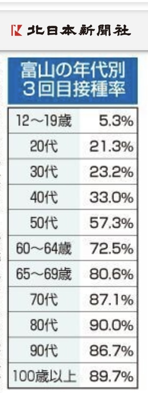 さて、昨日の朝刊に、富山県の年齢別の3回目のワクチン接種状況について掲載されていました。