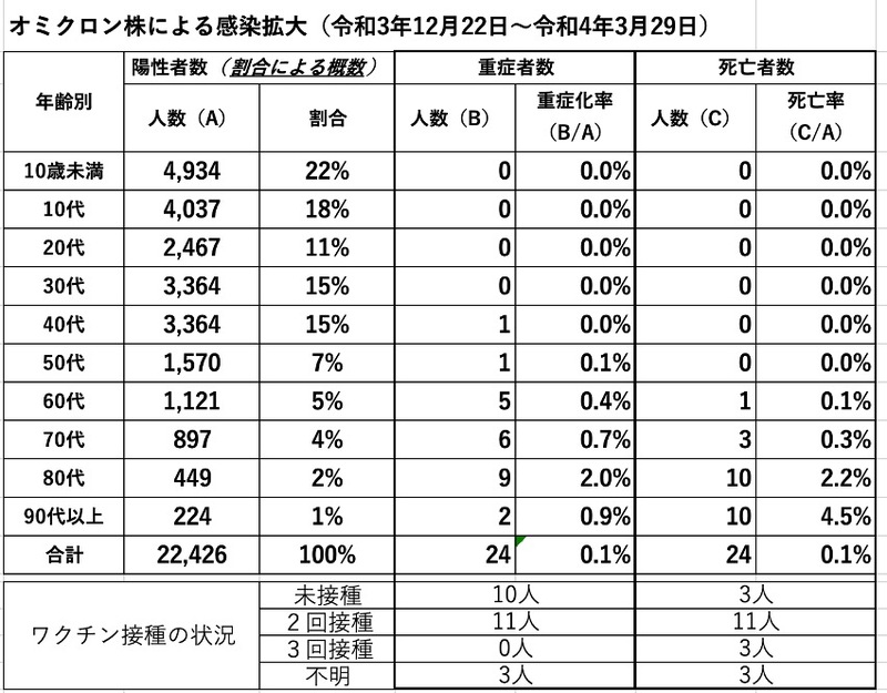 オミクロン株による感染拡大の中、3月29日までに24人の重症者が発生しましたが、30代以下はいません。また40代など壮年層の重症者についても基礎疾患等を有する方に限定されているようです。