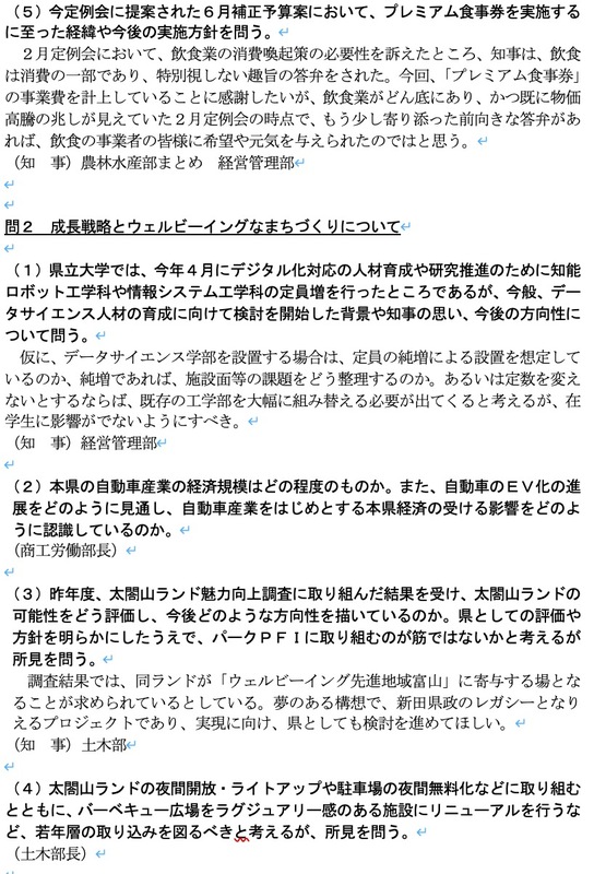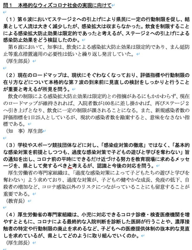 答弁は、どの答弁も、特筆するに値しない、これまでの考え方を踏襲するものばかりでした。本当に、県当局や教育委員会は、第6波で飲食などの現場で何が起きていたのかわかっているのか?、また学校現場の先生方の苦労は理解しますが、本当に、子どもたちへの影響を真剣に考え、議論しているのか、過度な感染対策のメリットとデメリットを県として検証しているのか、甚だ疑問でありました。