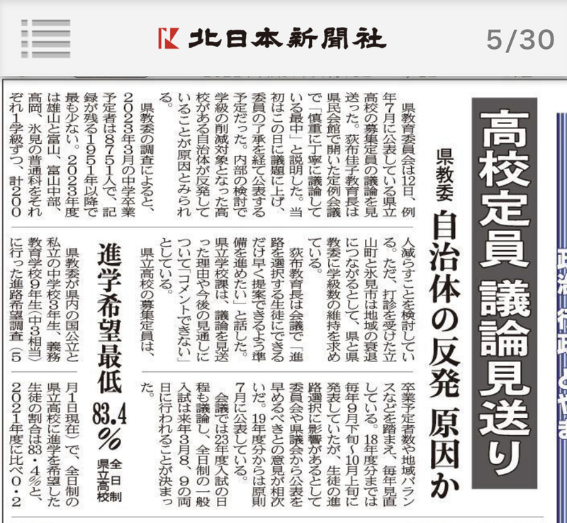 本日7月13日の地方紙は、「令和5年度の県立高校定員について」、富山県教育委員会議への議案提出が見送られたことを取り上げました。