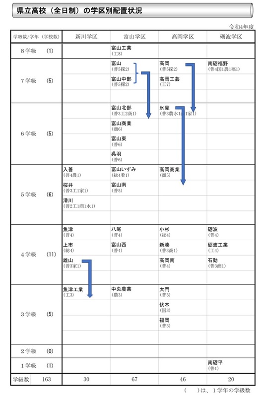 そんな中、職業系の県立学校である高岡工芸高校と高岡商業高校は必要な学科を配置する必要があり、学級数をいじることは難しく、高岡高校と氷見高校を除けば、残りは3学級もしくは4学級の小規模校しか、すでに残っていないのが実情です。