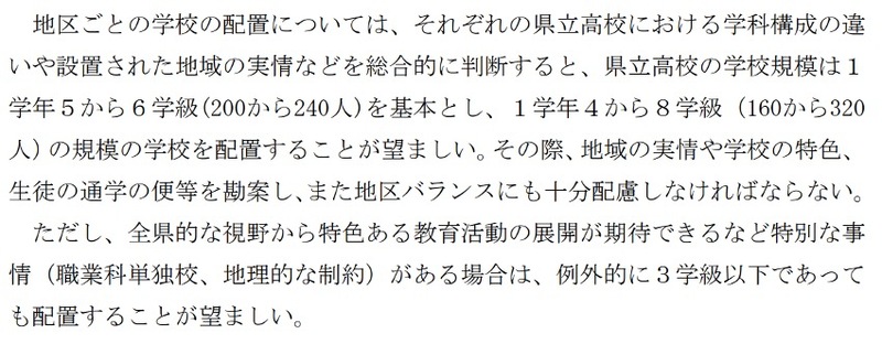 以下は、最後の県立学校再編(泊、福光、水橋、高岡西が統合)の議論の際にまとめられた平成28年の報告書の中身です。この中で、学校規模は4クラス以上が望ましく、3クラス以下の学校は例外的に設けるとしています。