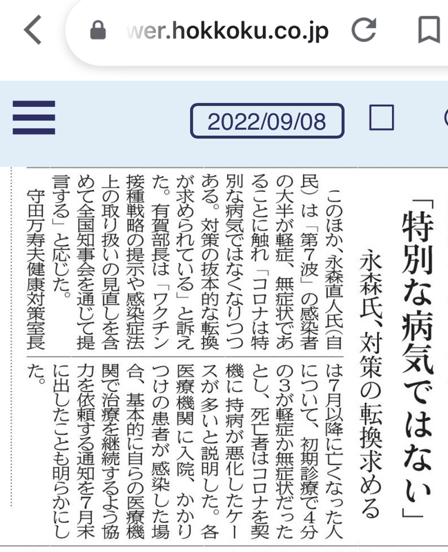 新型コロナウイルス感染症のリスクは数字上は季節性インフルエンザのリスクに近づきつつあり、コロナ対策の抜本的な見直しに向けて、政府や国の専門家部会は地方で起きていることをしっかり把握したうえで、現実に即した対応を求めたいと思います。