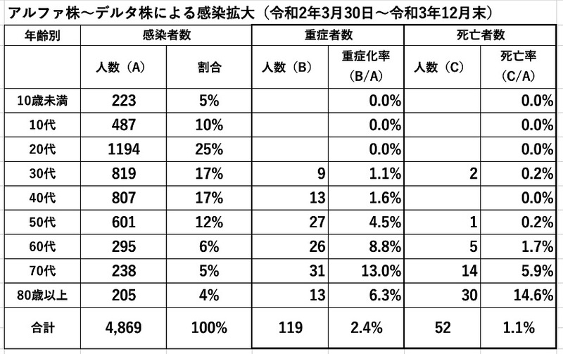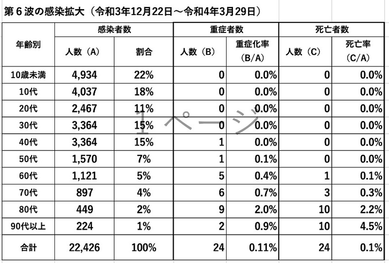 第6波(令和4年1月~3月21日)においては、10歳未満が22%、10代が18%、20代が11%、30代が15%、40代、50代、60代、70代と続いていき、年齢が低いほど多くの感染者が出ている状況でしたので、年齢構成はずいぶんと変化しました。