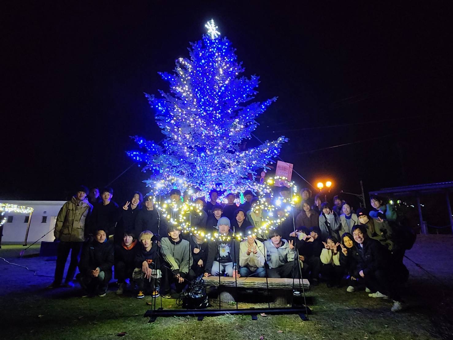 通常、このクラスのクリスマスツリーを立てると相当な金額(恐らく3桁万円)が必要になりますが、ご理解ある造園事業者の皆様と何よりも学生ボランティアの積極的な協力で、できているものです。