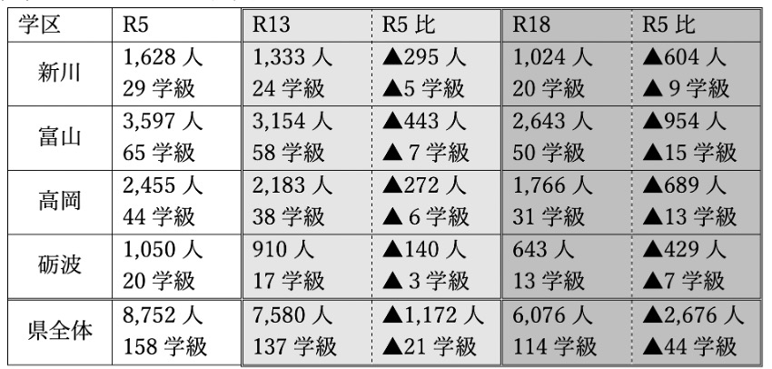 また、学区別では、4学級相当の学校に換算すると、計算上、新川学区で2校程度、富山学区で4校程度、高岡学区で3校程度、砺波学区で1校程度の学校減が必要となります。