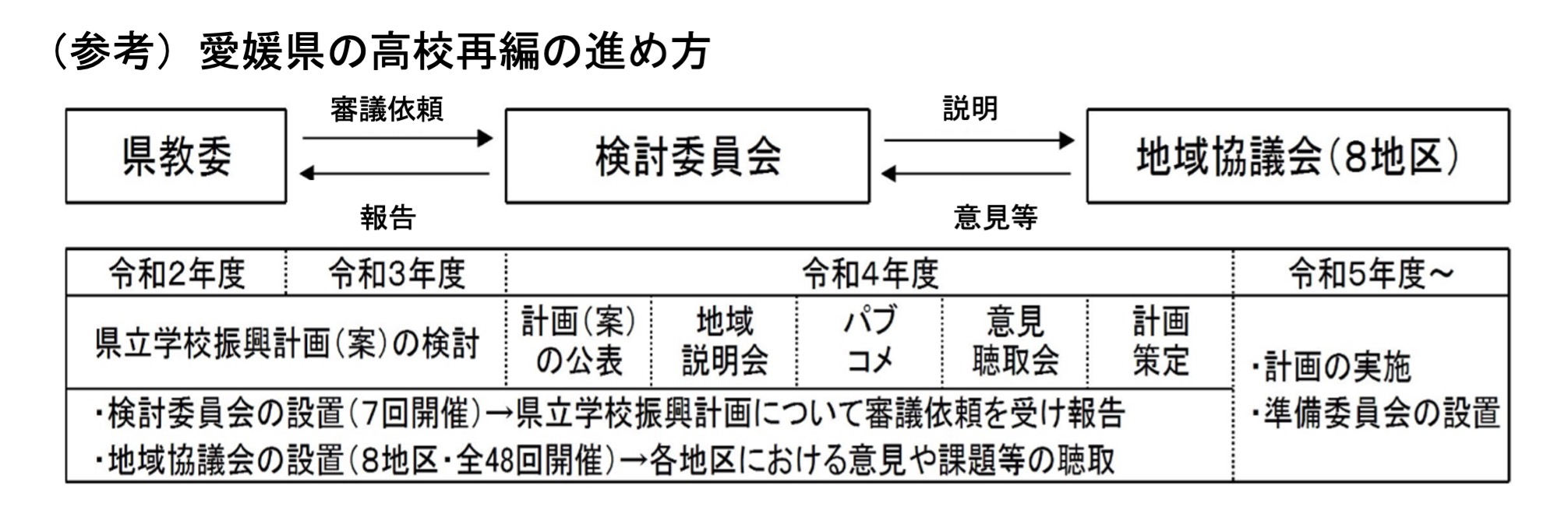下記は、愛媛県の高校再編の進め方です。本体の検討委員会と地域協議会(8学区)が常に意見を交わしながら、再編議論が進められています。
