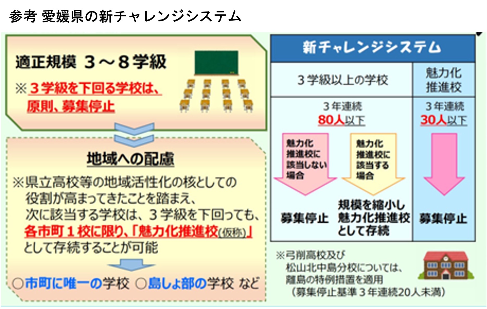 具体的には、愛媛県のチャレンジシステムような制度を活用してはどうかということです。3学級以上の学校において、「入学者数が3年連続で80人を切る場合は原則として募集停止とする」といった形です。