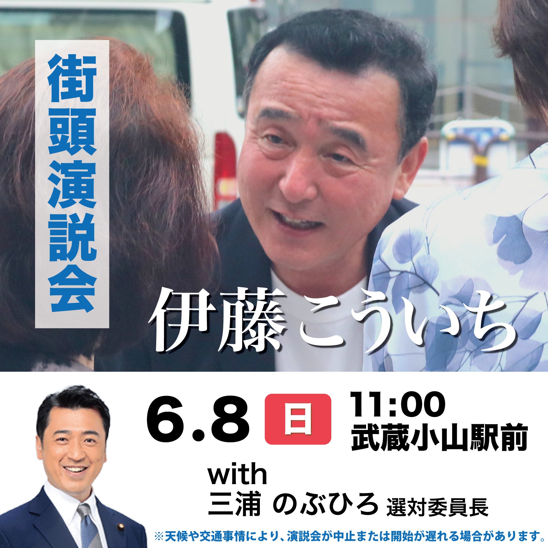 ホーム>政党・政治家>伊藤 こういち (イトウ コウイチ)>明後日6月8日(日)に 街頭演説会を行います💡