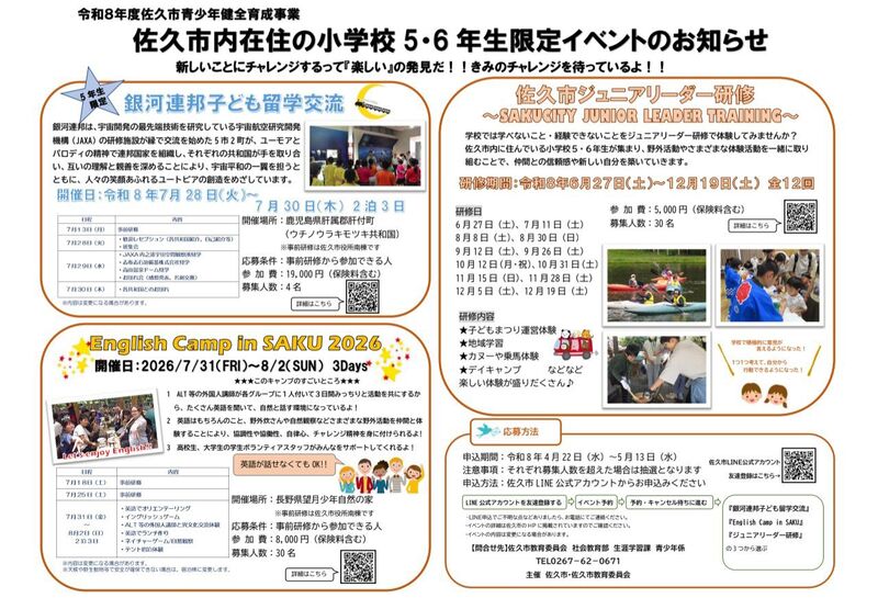 #佐久市 😀【English Camp in SAKU 2026 研修生の募集のお知らせ📢】 自然体験活動を通して、英語によるコミュニケーションの楽しさを感じ、「英語を学ぼう」という意欲を育てます😄 英語を身近に感じ、英語に親しむきっかけづくりを目的とした事業です‼️