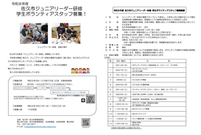 😄【令和8年度佐久市ジュニアリーダー研修「学生ボランティアスタッフ」】募集のお知らせ📢