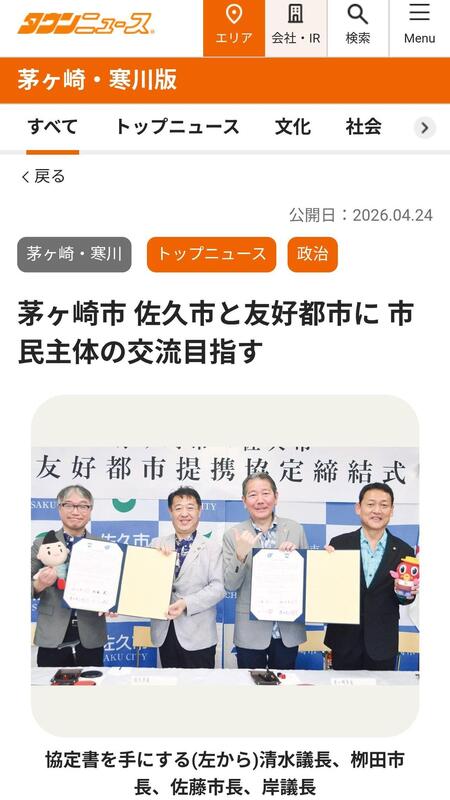 #茅ヶ崎市 は18日、茅ヶ崎市役所で長野県 #佐久市 との友好都市提携の協定締結式を行った。茅ヶ崎市が友好都市提携を結んだのは初めて。