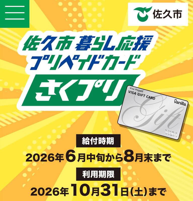 #佐久市 🌞【佐久市民1人あたり7,000円】‼️ 市では、食料品等の物価高騰が長期化する中、市民の皆様の家計負担を軽減するため、国の重点支援地方交付金を活用し、1人あたり7,000円相当のプリペイドカード(#バニラVisaギフトカード)を6月中旬以降に給付します😄