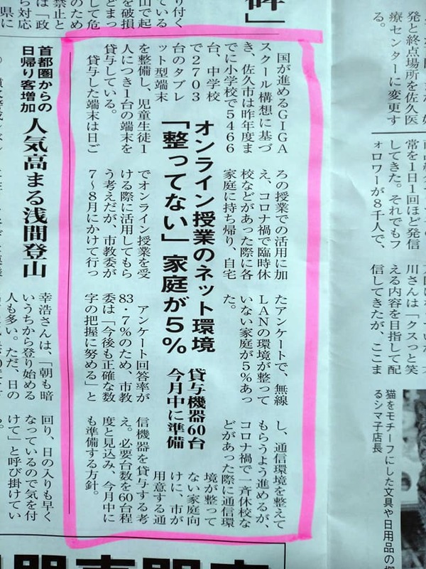 また、「インターネット通信環境が無いご家庭へは、学校が一斉休校になった場合には、市で用意した通信機器を60台程度、貸与を予定している」とのことで、一人の児童・生徒も取りこぼすことのない対応でありますが、今の時代、一人一台スマートフォンを所有している現状や、公平性の観点からも、貸与を恒常的にするのではなく、各家庭の責任において恒常的にインターネット通信環境が整うような方向に進めて頂ければと思います❣️