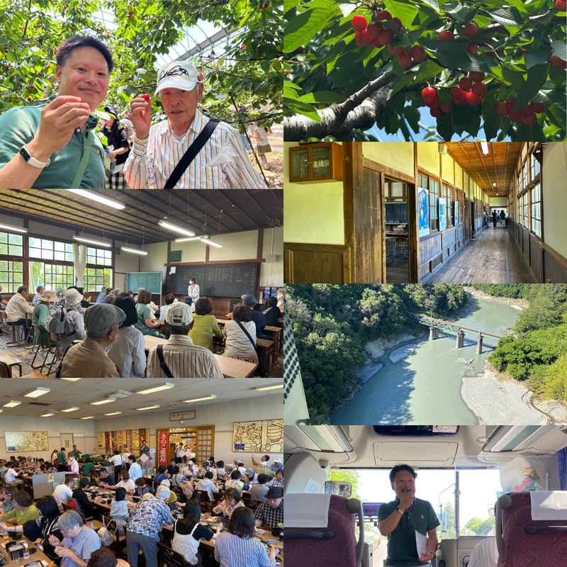 後援会バス旅行。先週末は絶好の天気の下、さくらんぼ狩りと南信州を散策しました。美味しいさくらんぼが食べ放題という事で、皆さん大満足。また、杵原学校では木造校舎で懐かしの授業を受けて頂き、そらさんぽ天竜峡では橋の上から絶景を楽しんで頂きました。活動報告を交えながら、楽しい一日を過ごす事が出来ました。