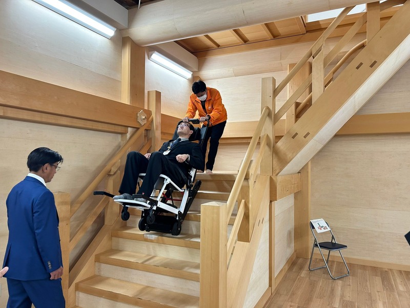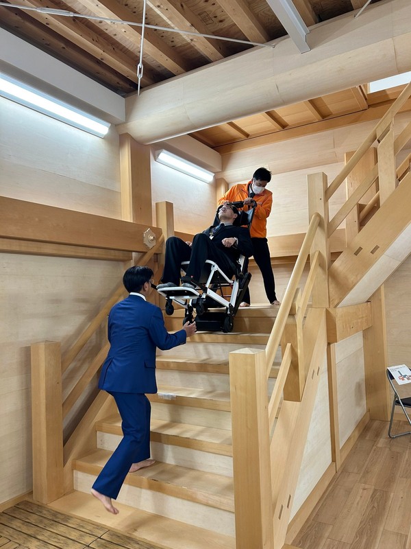本日、名古屋城木造天守閣事業における階段体験館「ステップなごや」にてクローラー付きの車椅子が実際に人を乗せ、昇降稼働出来るかのデモを名古屋総合事務所の協力にてテストさせていただきました。