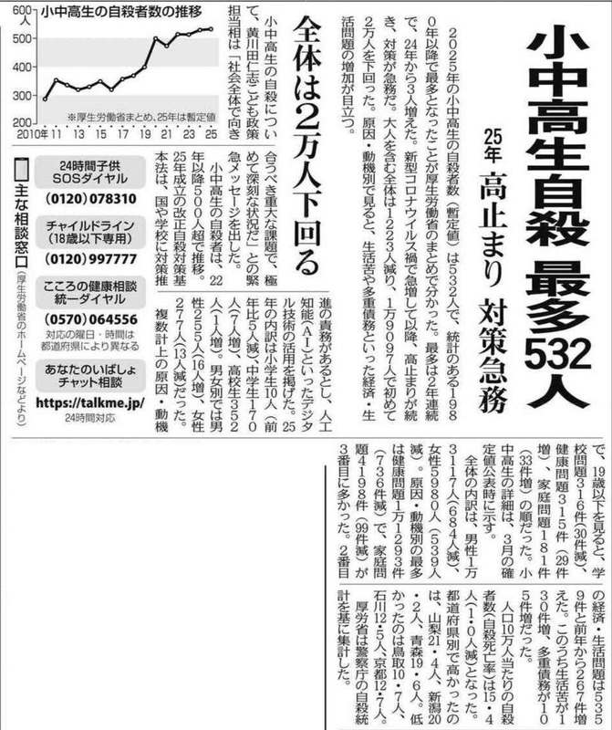 全体の自殺者が減った一方で、小中高生の自殺者数は532人(2024年比3人増)に上り、2年連続で最多となっています。