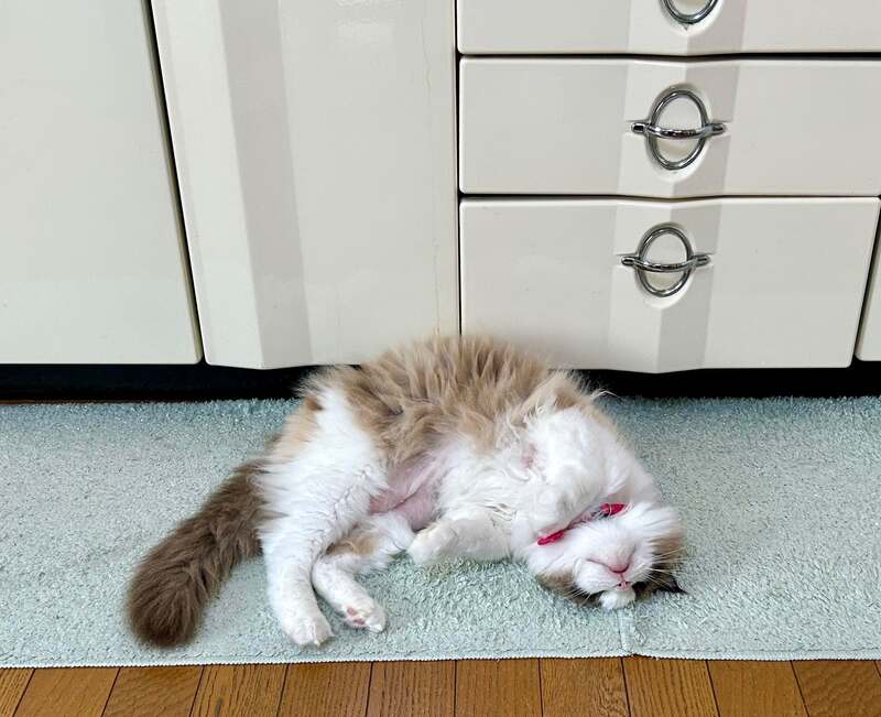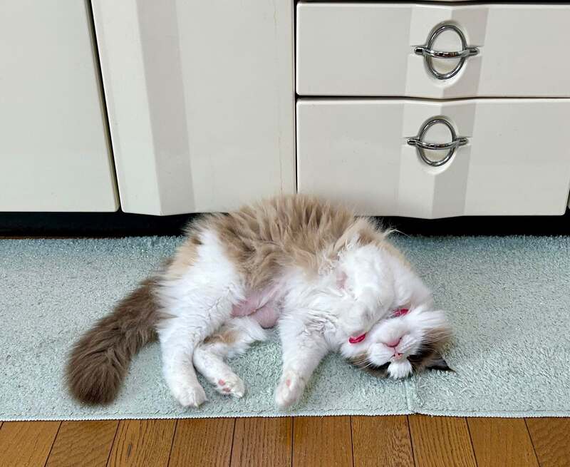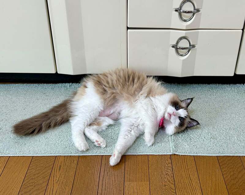【今日のミュウちゃん😻】朝からママのストーカー🐈キッチン立つママの横でゴロゴロ😍#ラグドール#...
