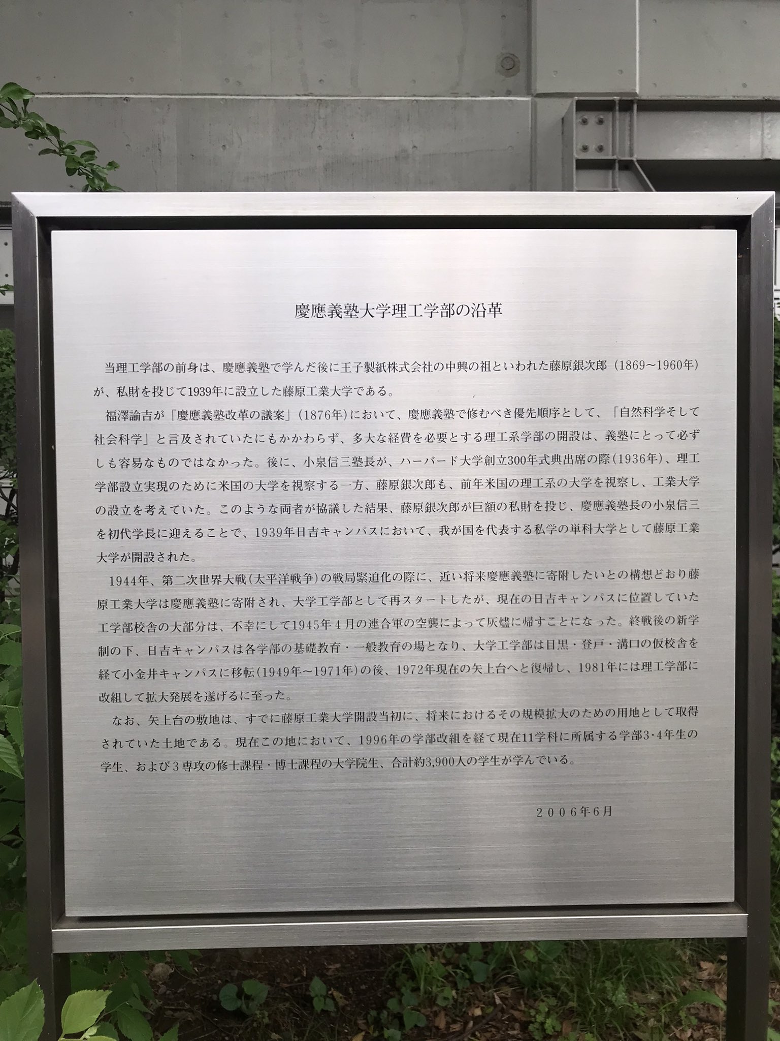 前身は卒業生の藤原銀次郎翁が設立した藤原工業大学。その後慶應義塾に寄付されました。
