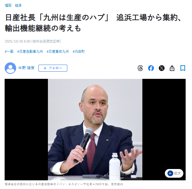 日産自動車のイバン・エスピノーサ社長が、苅田町にある日産九州工場を「最も重要な国内ハブとして発展させる」と発言いたしました。