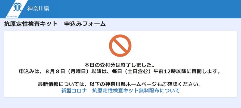一方で、この神奈川県の抗原検査キット無料配布事業ですが、申し込みが毎日11時からとなっており、当日分の受付が(あっという間に)終了してしまっている場合があります!なんだよ~~(# ゚Д゚)