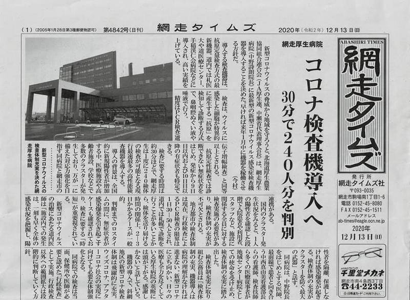 【地元紙『網走タイムズ紙』にも新型コロナウイルス感染症のクラスター化を防ぐための検査拡充設備の記事が掲載】